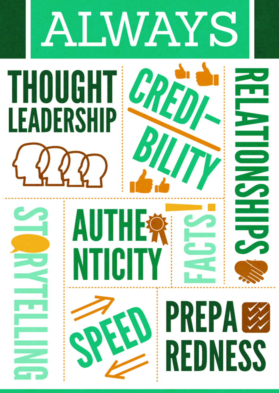 • Having your three to five key messages agreed upon,  ready and in front o’ your spokesperson. Ideally, we will have worked with the spokesperson on the messages so he/she feels true ownership.
